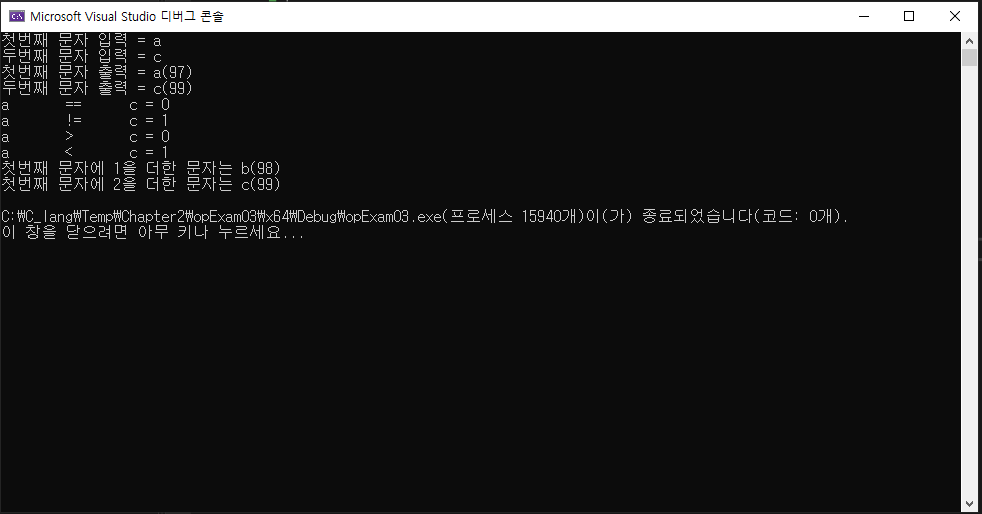printf("첫번째 문자에 2을 더한 문자는 %c(%d)\n", c1+2, c1 + 2);