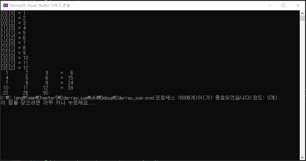 [0][0] = 1 [0][1] = 2 [0][2] = 3 [1][0] = 4 [1][1] = 5 [1][2] = 6 [2][0] = 7 [2][1] = 8 [2][2] = 9 [3][0] = 10 [3][1] = 11 [3][2] = 12 1 2 3 = 6 4 5 6 = 15 7 8 9 = 24 10 11 12 = 33 22 26 30 |